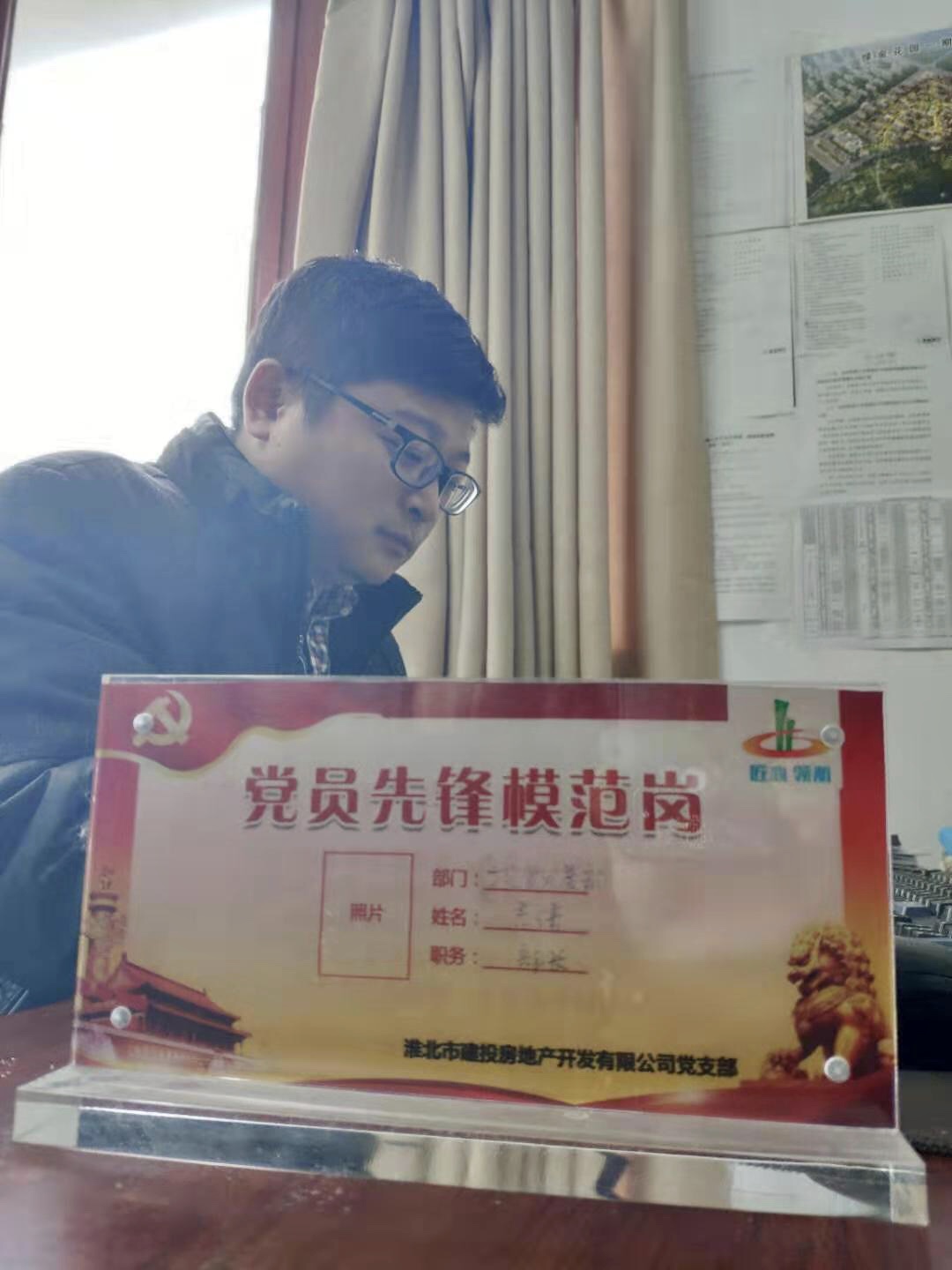 近日,房地產(chǎn)公司黨支部每個黨員的辦公桌上多了一塊鮮紅的桌牌,桌牌上黨員先鋒示范崗七個字尤為顯眼,上面還有黨員姓名和所屬部門。原來,這是該黨支部開展黨員“亮身份、比奉獻”活動,特意給黨員制作的示范崗位牌。