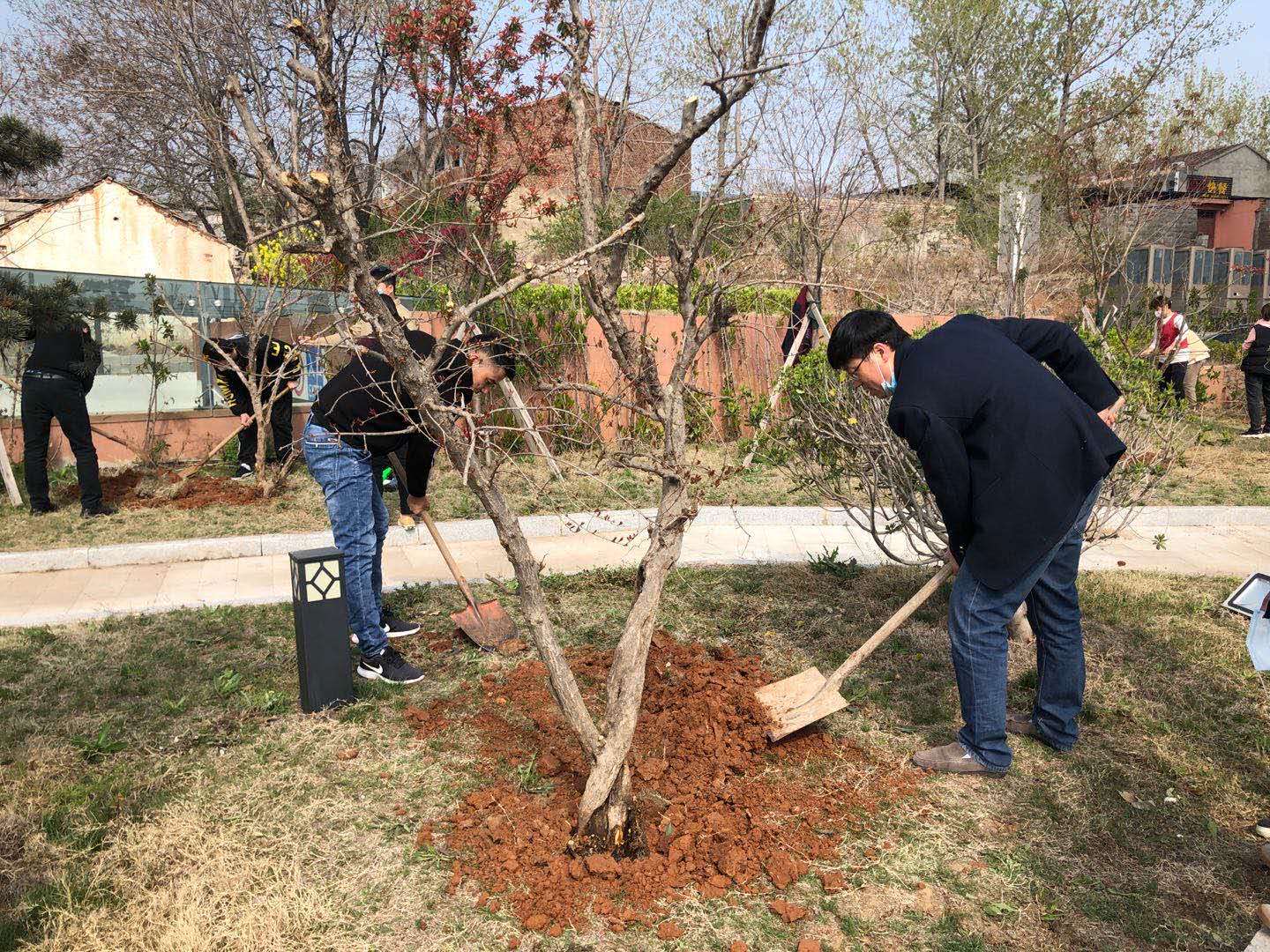 支部副書記張爭光對本次活動作出了分工安排,黨員同志身先士卒,員工們情緒高昂,大家互相配合,有的揮鍬鏟土 、有的扶樹填土、有的培土澆水,每個都忙的不亦樂乎。