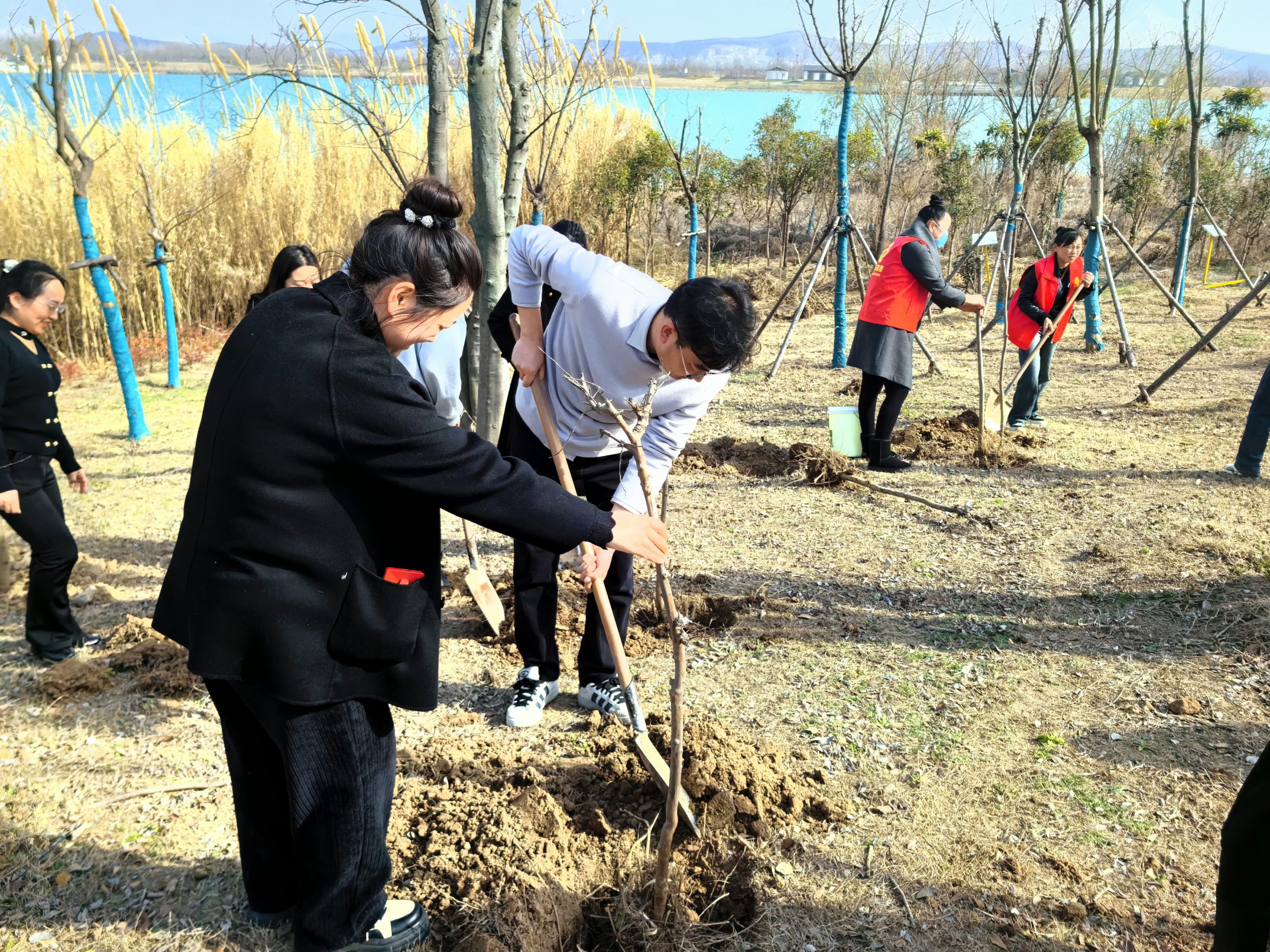 迎著微風(fēng),大家?guī)瞎ぞ?,熱情高漲、干勁十足,積極投入到植樹(shù)活動(dòng)中。揮鍬鏟土、栽苗培土、踩實(shí)土壤,大家協(xié)作配合,現(xiàn)場(chǎng)一派火熱繁忙景象?;顒?dòng)中共栽植30余棵樸樹(shù),栽種樹(shù)苗整體錯(cuò)落有致,生機(jī)盎然,為綠金湖增添了一道靚麗的風(fēng)景線。