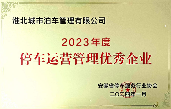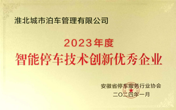 2024年1月,淮北城市泊車(chē)管理有限公司被安徽省停車(chē)服務(wù)行業(yè)協(xié)會(huì)授予2023年度“智能停車(chē)技術(shù)創(chuàng)新優(yōu)秀企業(yè)”、“停車(chē)運(yùn)營(yíng)管理優(yōu)秀企業(yè)”的殊榮。