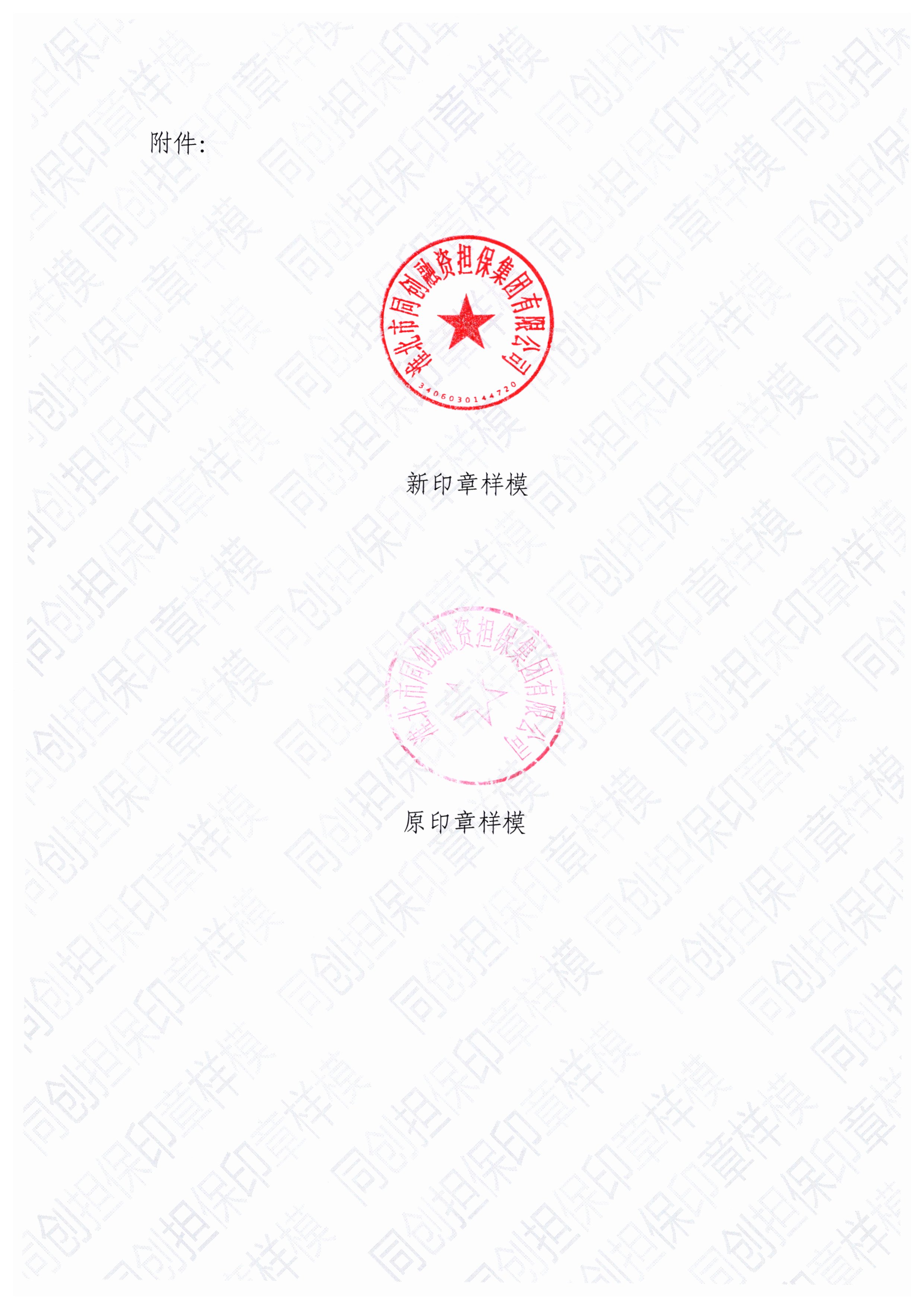 根據(jù)工作需要,從即日起啟用“淮北市同創(chuàng)擔(dān)保集團(tuán)有限公司”新印章,“淮北市同創(chuàng)擔(dān)保集團(tuán)有限公司”原印章同時(shí)廢止。