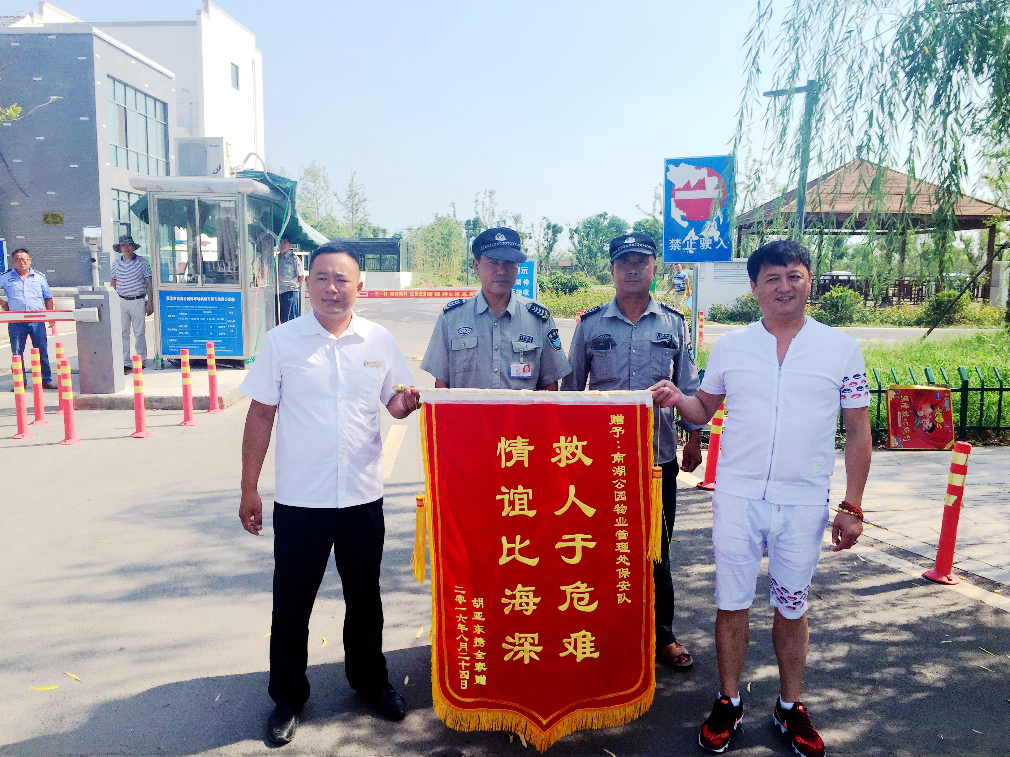 8月24日上午,南湖公園迎來了一名特殊的游客,他帶著鞭炮、手捧錦旗,希望找到昨晚救下他親人的保安,當(dāng)面表示感謝。