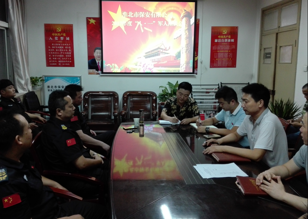2017年7月27日下午19時(shí),市保安公司"八一"建軍節(jié)座談會(huì)在二樓會(huì)議室舉行,金融武裝押運(yùn)及人力防范退伍士兵隊(duì)員歡聚一堂,共慶光輝節(jié)日,共憶光榮傳統(tǒng),共敘魚水深情。