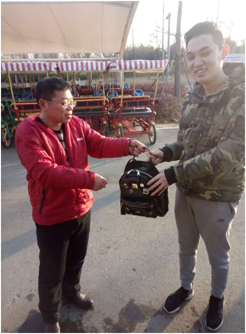 12月21日下午3點(diǎn)半,一位來自河南的游客在乘坐南湖景區(qū)觀光車游覽時(shí),不慎將隨身攜帶的背包遺忘,被南湖景區(qū)電瓶車班長朱德標(biāo)及時(shí)發(fā)現(xiàn),并通過身份證上的信息物歸原主。失主對朱德標(biāo)這種拾金不昧精神和急游客所急的服務(wù)態(tài)度感到萬分感謝,激動(dòng)地說:“非常感謝,要是沒有錢包和證件我此后的行程會(huì)有很大影響,南湖人真是好!”。