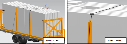 a. 墻板運(yùn)輸,必需使用直徑不小于8.7天然纖維芯鋼絲繩或3.5T手動(dòng)葫蘆,將運(yùn)輸架與車架載重平板綁緊,且前端與后端至少兩根,鋼絲繩與構(gòu)件接觸部位需用護(hù)角保護(hù);